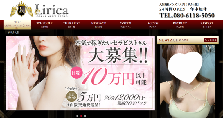 大阪高級メンズエステ【リリカ大阪】は堺筋本町駅徒歩5分に位置する最高級メンズエステサロンです。容姿端麗なセラピストによるオールハンドの極上施術で、トロトロの高級オイルを500ml以上使用したオイルドバドバ施術、鼠径部集中ディープデトックス、衣装チェンジなど贅沢なサービスを追加料金なしでご提供。24時間営業・年中無休でお客様をお迎えしており、完全個室での最高峰のリラクゼーション体験をお約束いたします。