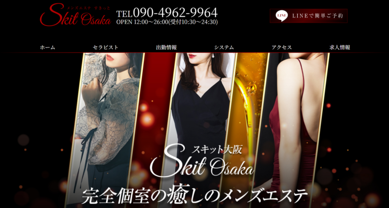 大阪・心斎橋(アメリカ村)・堺筋本町・南船場にあるメンズエステ「すきっと(スキット)」は、日本人セラピストによるオイルマッサージが自慢のプライベートメンズサロンです。完全個室のマンションエステで恋人気分を味わえる癒しの空間をご提供。多数の魅力的なセラピストが在籍し、心身ともにリラックスできる至極のひとときをお届けします。12時から深夜26時まで営業しており、お客様のご都合に合わせてご利用いただけます。