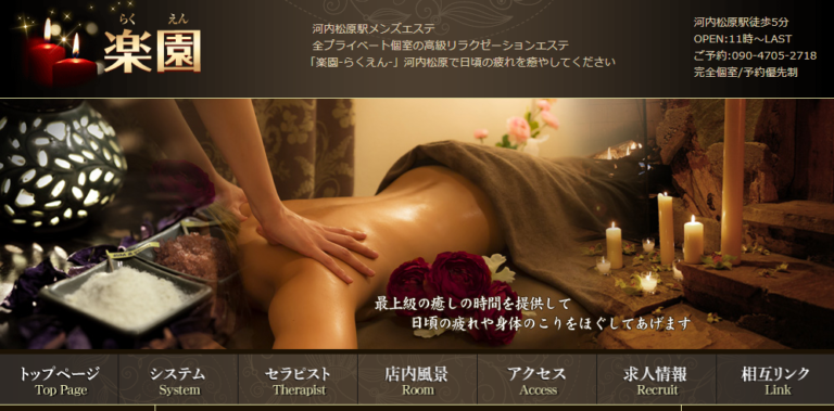 河内松原駅徒歩5分の楽園-らくえん-は、フェロモン溢れる美人セラピストたちによる本格リラクゼーションエステを提供しています。全プライベート個室の高級な空間で、アロマオイルマッサージ、リンパマッサージ、パウダーエステ、洗体サービスなど多彩なメニューをご用意。甘い雰囲気の中でテクニカルで繊細な施術をたっぷりとご堪能いただけます。日頃の疲れを癒やしに是非お越しください。